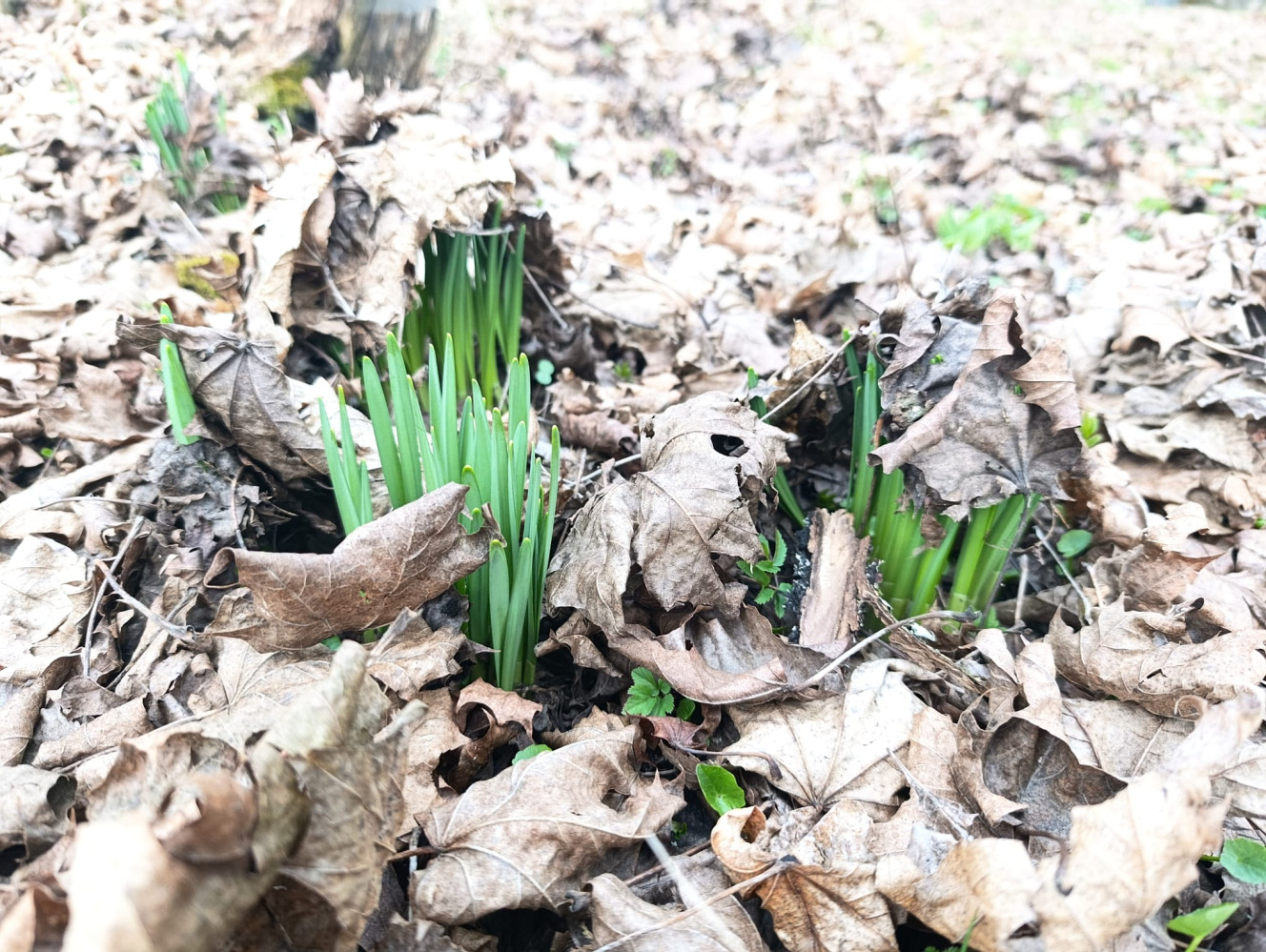 Z pod peřiny shrabaného listí vykukují probouzející se narcisy, které do země zasadili původní obyvatelé Zigartic.