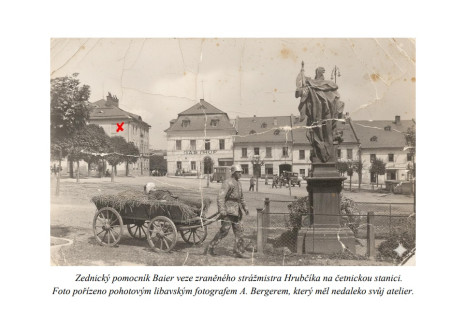 U okraje chodníku stál dřevěný vozík vystlaný slámou, v ní ležel Hrubčík s obrovským obvazem na hlavě, něco nesrozumitelně vykřikoval a střídavě zvedal levou nebo pravou ruku. U vozíku stál zednický pomocník Baier, celý zapráskaný od malty. Na hlavě měl Hrubčíkovu přilbu, u pasu jeho šavli a přes záda služební pušku. Kolem poskakovaly děcka z náměstí. „Jménem zákona, rozejděte se! Tady není žádný tyátr!” Vykřikl Váňa a už táhl vozík do průjezdu. „Grüß Gott. Dafür kann mir keine Schuld gegeben werden. Die Tür war verschlossen und es gab keine Klingel,” plačtivě povídal Baier a pomáhal tlačit vozík.