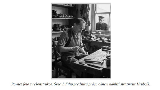 „Aliku ticho,” zavelela psovi, který asi proti Hrubčíkovi něco měl, a zavolala na četníka ať jde nahoru. Byla to manželka dědy Filipa. Byla sice Němka, ale mluvila plynule česky. Filip byl Čech. Svoji chudobnou ševcovskou živnost provozoval ve světlejší části kuchyně. V druhé polovině hospodařila jeho žena, která měla tím pádem absolutní přehled o příjmech a výdajích dědovy živnosti, což mu pěkně pilo krev.