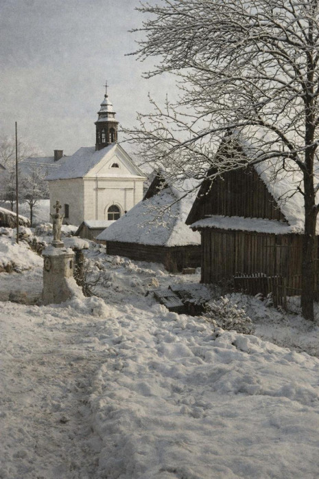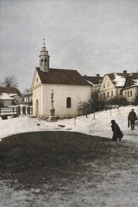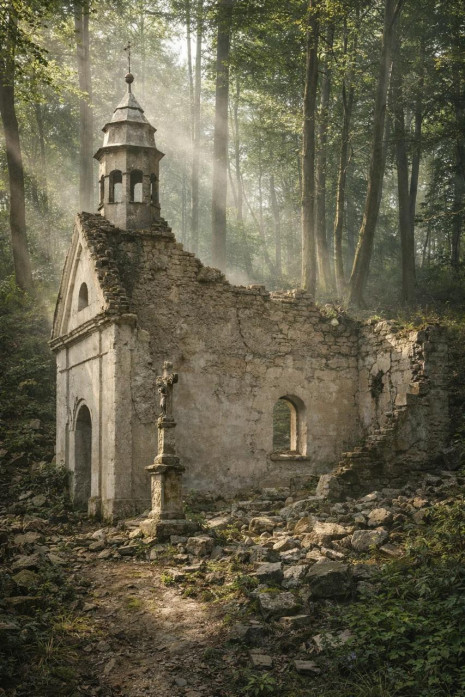 Do hodiny jsme měli v emailu první fotky a rozpracovanou podobu ze 3D programu - trochu "skřípe" rozměr apsidy, pohled na ni na fotografiích, které máme, není. Uchvátily nás fotografie, které architekt udělal jen tak, ve spolupráci s AI. Dojemný je pohled na "polorozpadlou" kapli - ve stavu, v jakém je dnes možné vidět kostely z některých zaniklých obcí ve VVP Libavá, např. Barnov nebo Jestřabí.