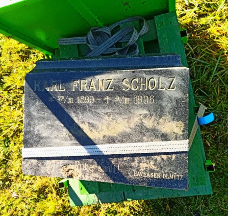 Kdo a proč kdysi těžká roznorodá torza dovlekl až sem, zůstává záhadou. Dnes se díky Emilově trojnožce povedlo rozvalený náhrobek rodiny Scholzovy opět sestavit.