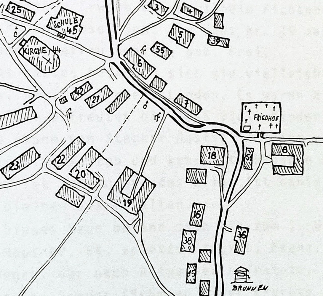 Nový hřbitov se nacházel v blízkosti většího statku čp. 8, k němuž patřilo 28 hektarů pozemků (před odsunem hospodářství vlastnila rodina Aloise Golda, dříve rodina Heger). Přímo naproti vstupu na hřbitov stál od roku 1923 ještě dům čp. 51 Eduarda Sommera. Pro zajímavost dodejme, že jeho dcera Edith nebyla po roce 1945 odsunuta, neboť se provdala za Čecha.