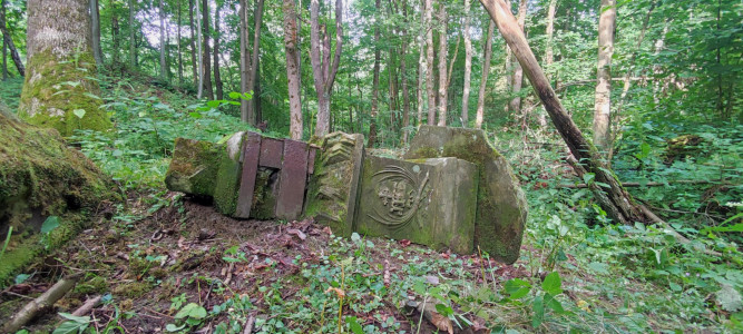 V červencovém podvečeru stojí v zaniklé obci před pozůstatky kaple sv. Notburgy 3 členové spolku Lubavia a kameník. Ukazujeme kameníkovi, panu Antonínu Drábkovi, pozůstatky kaple a kříže, povídáme se o zaniklé obci a diskutují se možnosti opravy kříže. Obhlížíme viditelné části kříže rozeseté na ploše před (neexistující) kaplí a jejich stav.