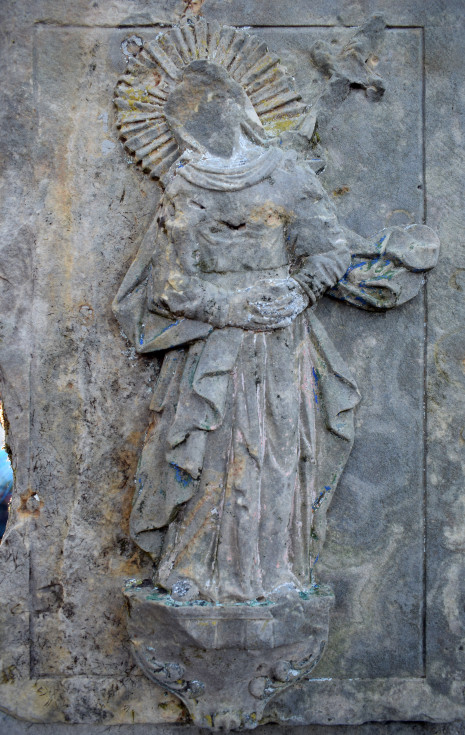 Na stéle je vyobrazena postava se svatozáří a mečem. Po jejím vyproštění nebylo možné určit, o koho by se mohlo jednat. Po preciznějším mechanickém čištění jsou detaily na reliéfu čitelnější. Jsou vidět jemné náznaky rysů obličeje a zdá se, že se jedná o ženskou postavu se sepjatýma rukama před tělem. Meč vede přes levé rameno postavy do těla a vstupuje do něj (je zabodnut) kousek nad srdcem.