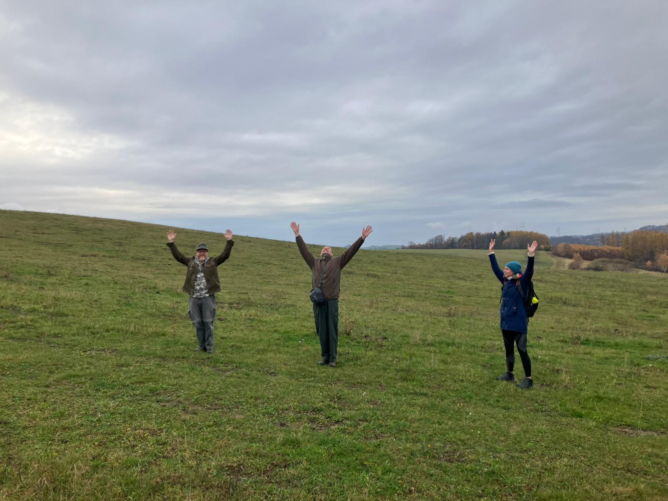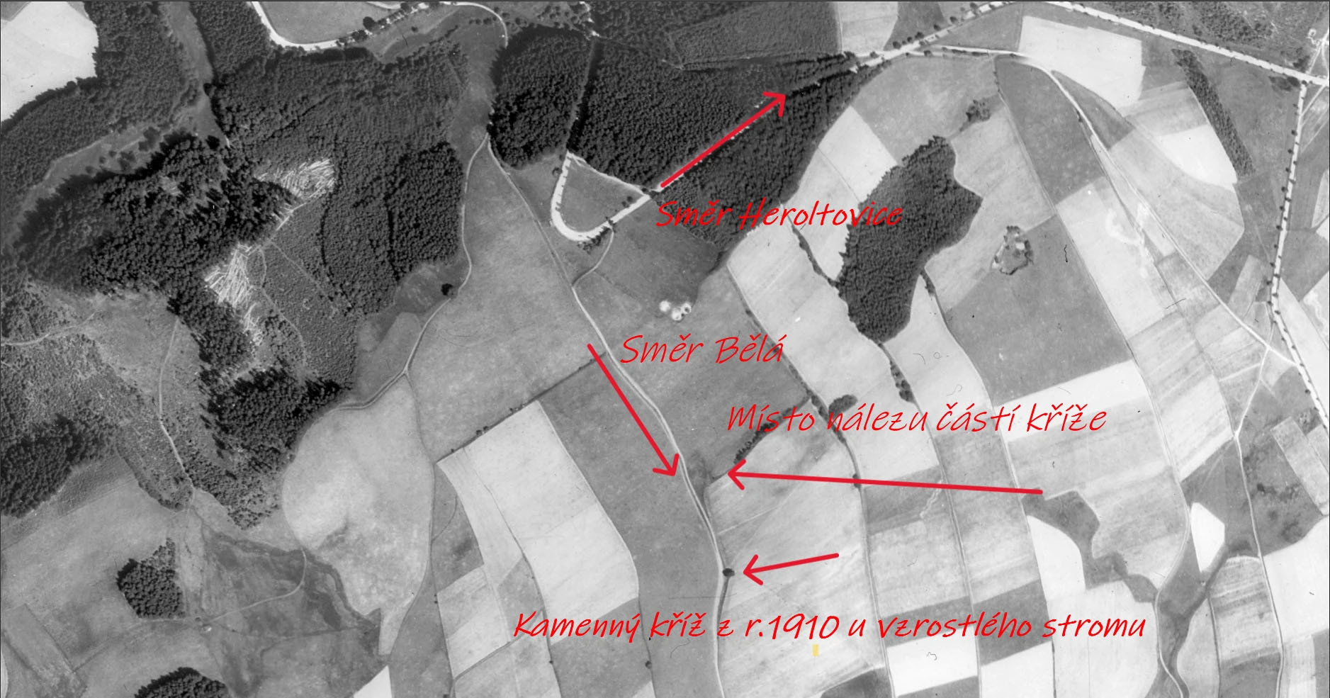 Již v červnu 2023 se našim členům podařilo sokl a středovou část vyzvednout z místa, kam byly tyto části po rozorání mezí odsunuty, a včera na schůzi Pavel sdělil, v jaké fázi je aktuální stav památky a možnosti jejího opětovného vztyčení. Po schůzi se pak několik členů vydalo se podívat na místo, kde kříž původně stál a odhadnout možnosti nového umístění, které by mohly být potřebným subjektům navrženy k jednání. Bývalo zvykem, že kří. Na poslední fotografii pózují 3 členové na původním místě a zobrazují kříž a z každé strany stojící strom, jak tomu u kříže původně bylo.